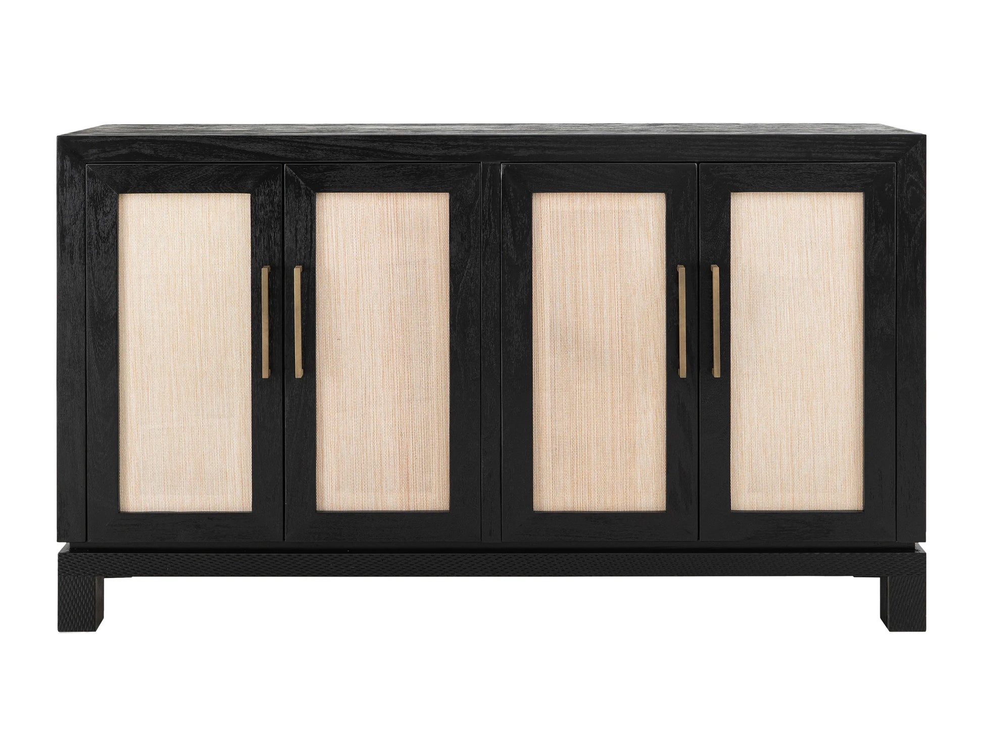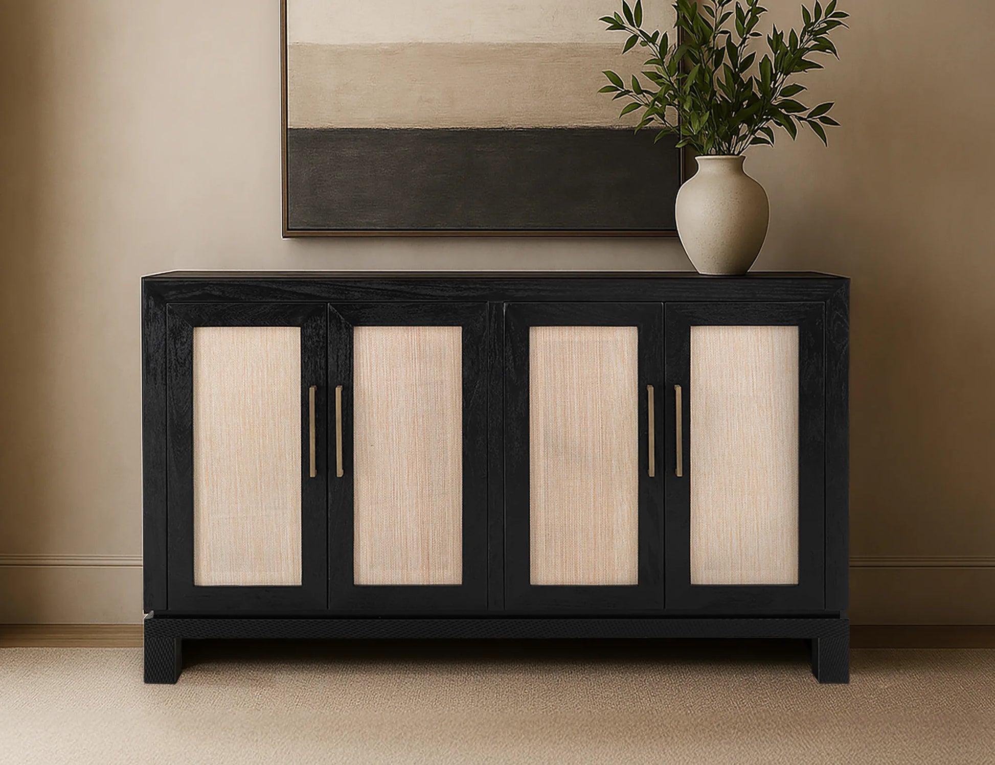 4 Door, Console. Bring warmth and character to your home with the Solara Console, expertly handcrafted from solid Melina wood and finished in a rich black lacquer. The door panels are adorned with woven yucca fiber, and the base features CNC-machine textured, providing a touch of organic charm and elegance. It features two shelves for practical storage and custom metal pulls; the Solara seamlessly combines artistic details with functional design, crafted to be cherished for a lifetime.
