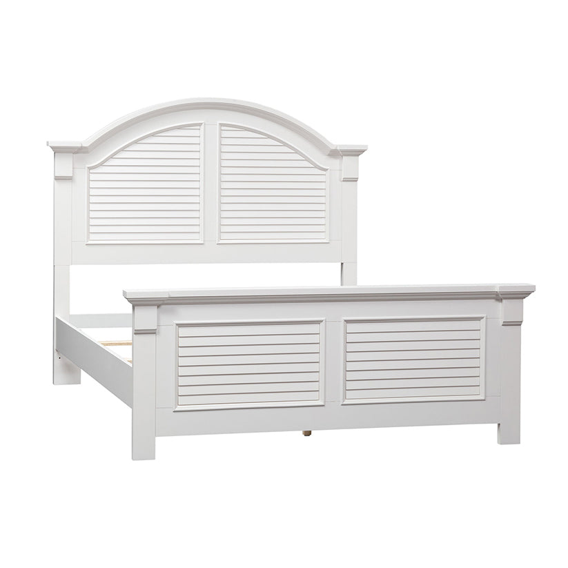 Invite the cottage style Summer House panel bed into your room. The oyster white finish is accented by louvered panels and arched crown molding, adding to the cottage charm. Made of pine and poplar solids, this bed features bolt-on rails and a center supported slat system, making this a sturdy and reliable bed.