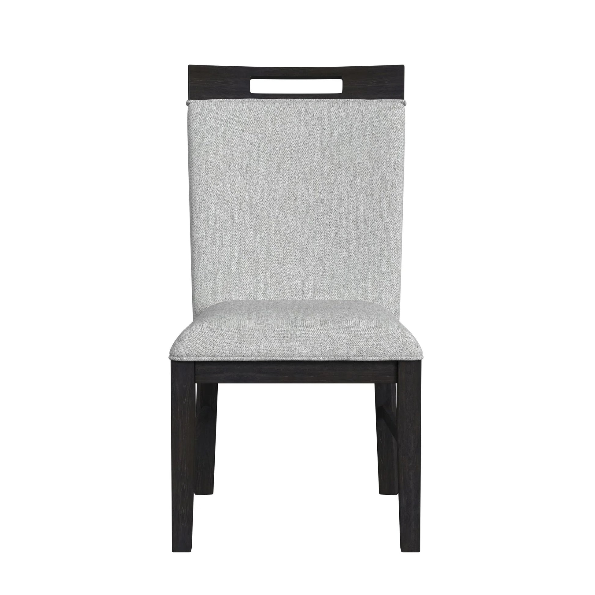 Bring modern elegance to your dining space with the Transcend Dining Side Chair set, which includes two beautifully crafted chairs. The bold charcoal-finished frame creates a striking contrast against the light gray upholstery, adding a touch of sophistication to your decor. A unique open cutout in the chair back not only enhances visual appeal but also offers easy portability. Designed for comfort, the foam-padded seats invite long, leisurely meals. Built with a combination of hardwood and manufactured wood, these chairs ensure lasting durability and strength. Elevate your dining experience with the timeless style and comfort of the Transcend Dining Side Chair.