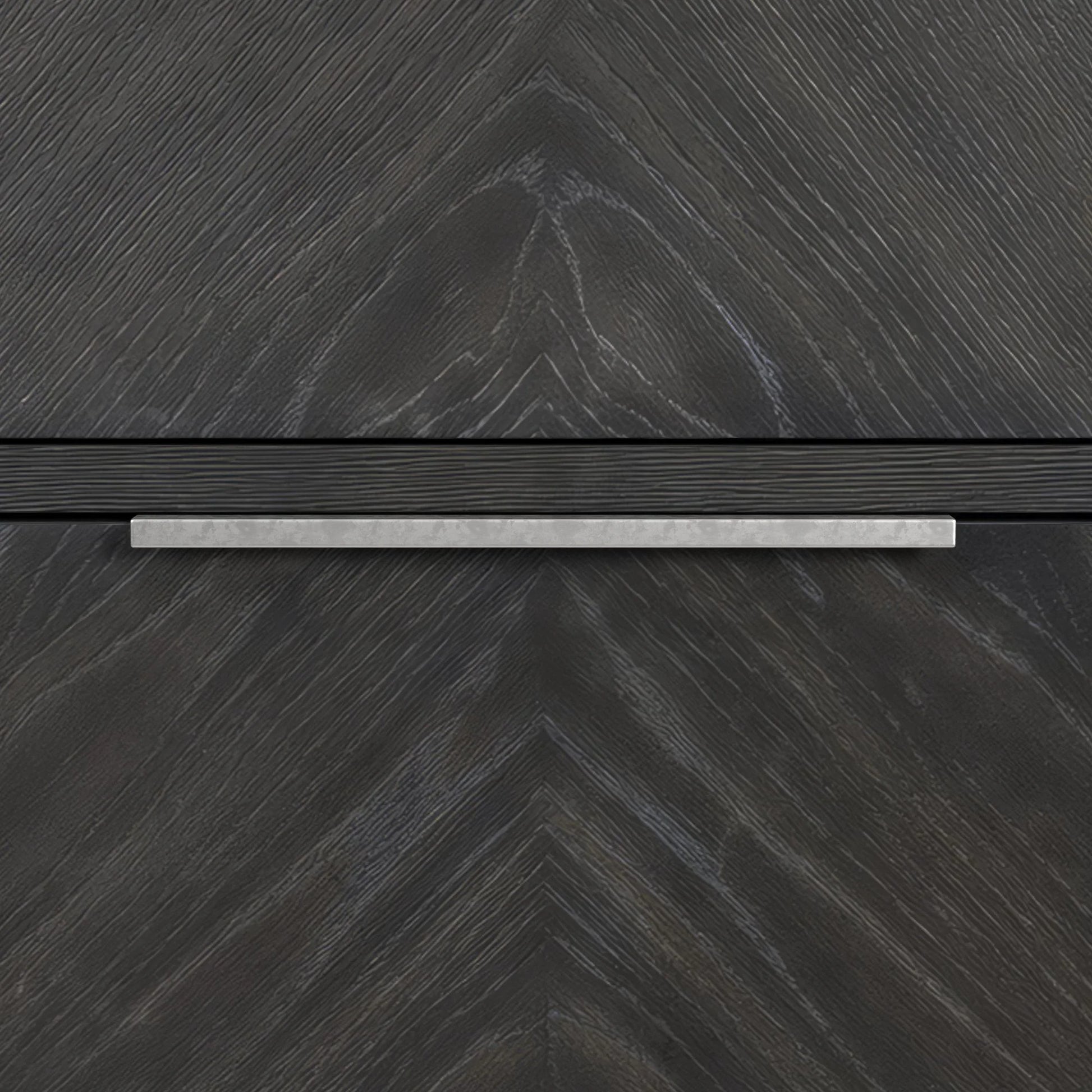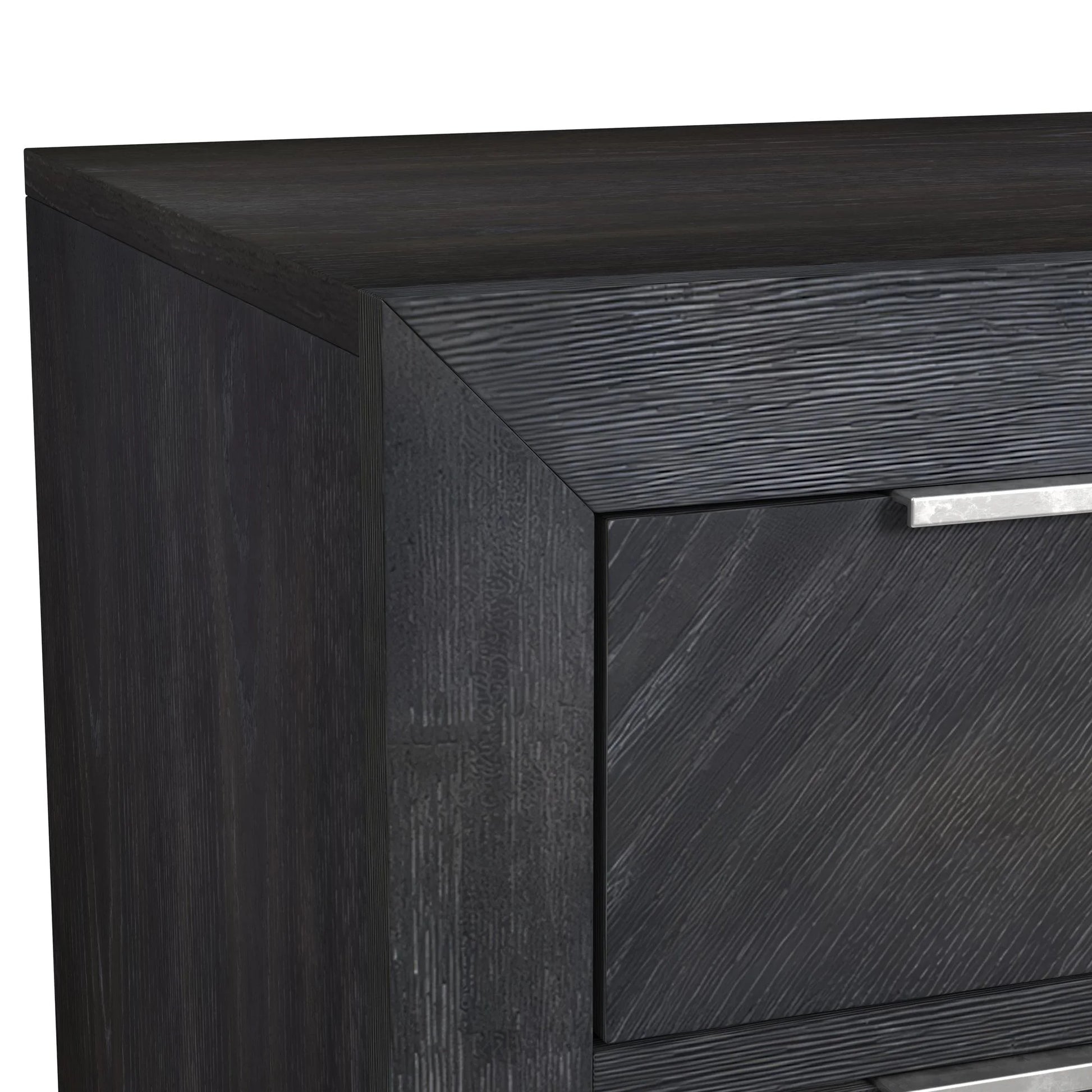 Elevate your dining space with the Transcend Server, where bold design meets functional elegance. Rich charcoal tones beautifully enhance the intricate woodgrain, adding warmth and depth to the space. Crafted from a durable wood frame with a stunning oak veneer, the server features eye-catching chevron and herringbone patterns for a striking visual statement. Sleek metal handles provide a modern accent, allowing for easy access to spacious storage, while brown felt-lined drawers protect delicate items, adding a luxurious touch. The Transcend Server is the perfect blend of style and functionality, designed to complement any contemporary dining room.