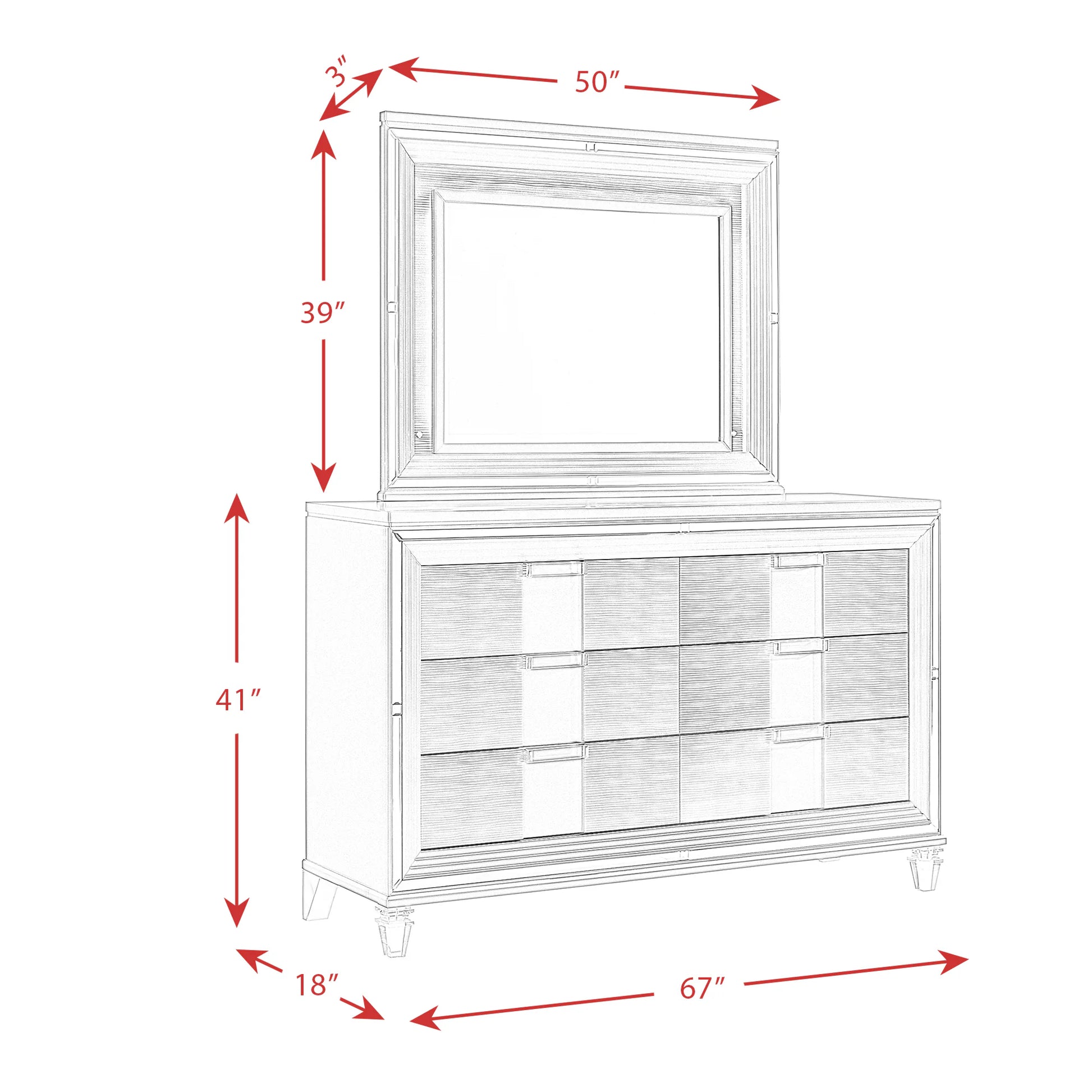 Twenty Nine 6-Drawer Dresser with Mirror is bedroom goals! This fabulous dresser not only looks pretty and glamorous, but its also super practical. This bedroom staple offers six, spacious drawers while the top two drawers have felt-lined hidden drawers; perfect for storing away your more valuable possessions. The mirror features an LED mood lighting, creating the ideal ambience for your bedroom. Along the front is a mirror glass trim, adding extra flair to this already stylish piece. The clear, acrylic drawer handles and feet are the perfect finishing touches to this dresser that will instantly become a bedroom staple for years to come!
