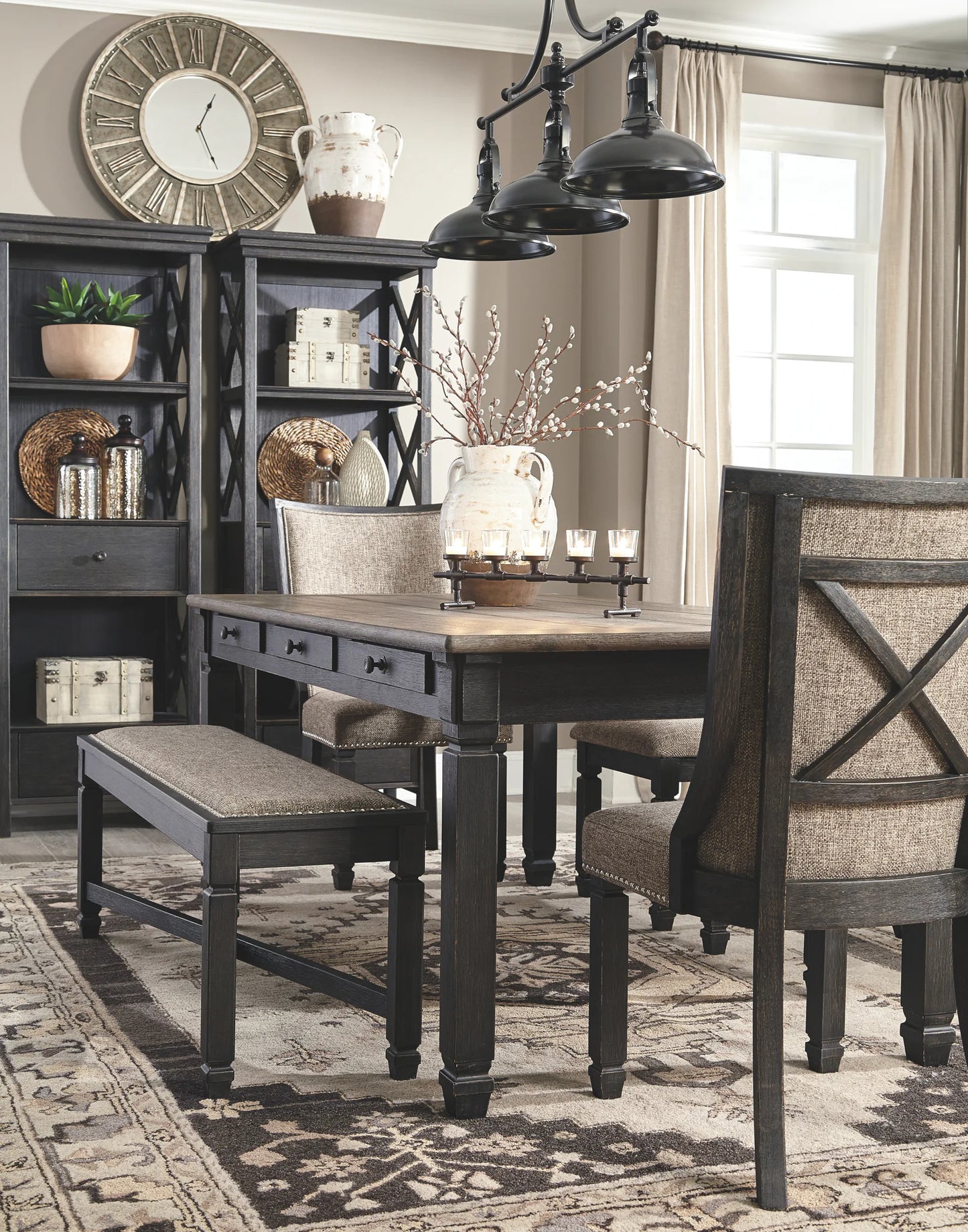 Invite your family into the heart of your home with this upholstered dining room chair. Framed back and tapered legs are a sturdy foundation. Black finish is beautifully textured. Heavily woven fabric has a quality feel-good touch. Silvertone nailhead trim is decorative without all the fuss. This is trend-right urban farmhouse style.