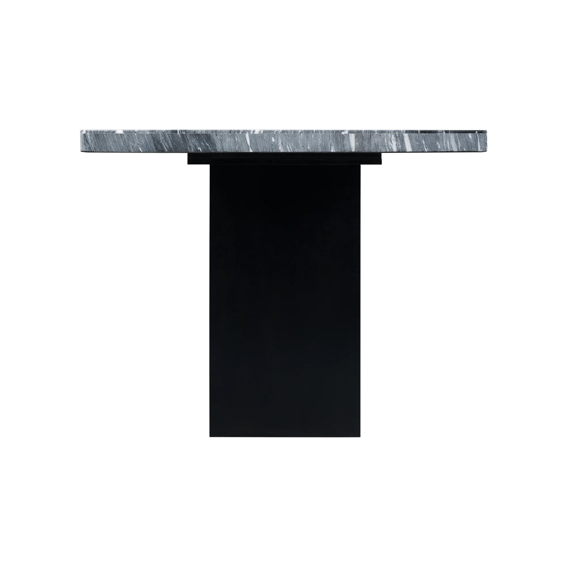 The Valentino Grey Counter height dining collection will add a bit of glam, to your contemporary space, with the robust and modern silhouette. Entertain your guest around this natural marble top, that beautifully showcases the variations of color. The top is nicely contrasted by the ebony black shaped base, giving your dining space a look of effortless elegance. Finish your design with a variety of chairs. We love the pairing of a velvet side chair with nail head trimming.