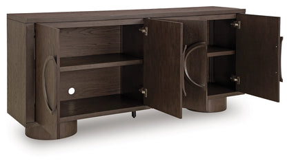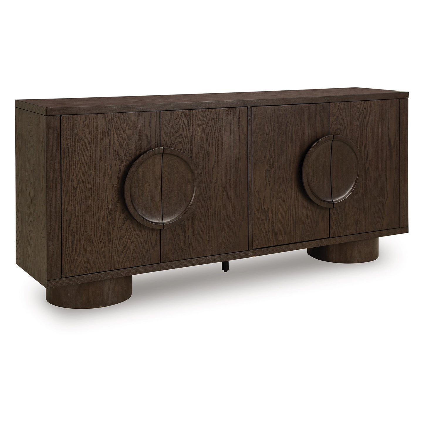 Sleek. Striking. Sculptural. This accent cabinet refines the art of functional fashion. Outfitted in a luxe dark brown finish, it’s an apt addition to contemporary entryways or dining areas. Its distinctive linear profile is beautifully contrasted by the curves of the oversized round legs and circular door pulls. Elevate your entertainment space when you stage this cabinet as a TV stand—openings in the back keep cords and cables organized for a clean, neat look.