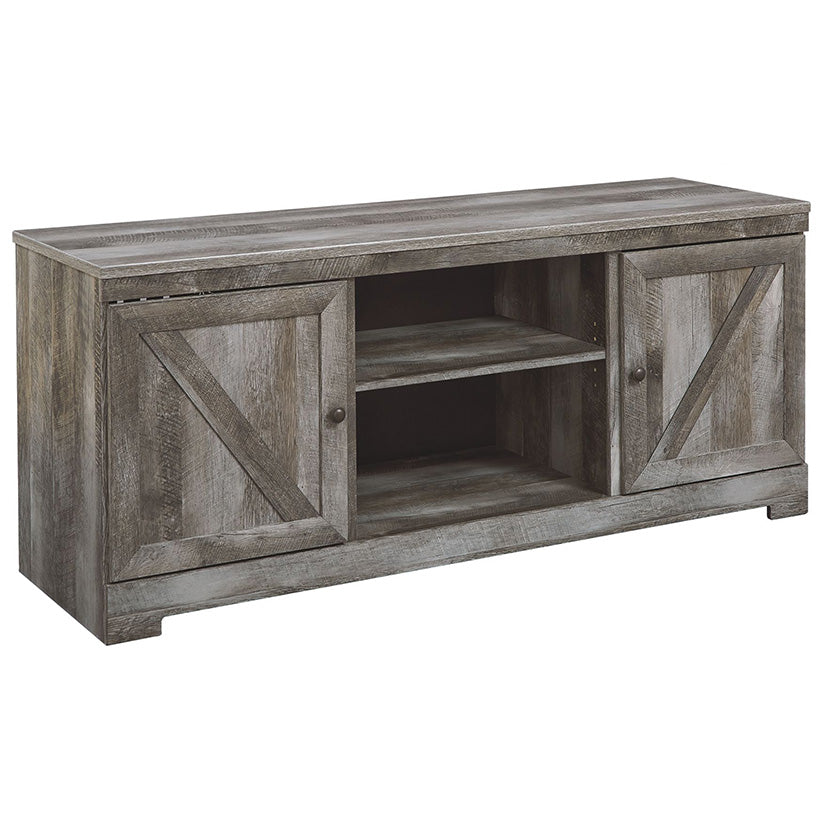 This TV stand with fireplace option is sure to win your heart with its daring designer take on modern rustic. The stand’s crisp, clean and minimalist-chic profile is enriched with a striking replicated oak grain with thick plank styling and a weathered gray finish for that much more authentic character. Crossbuck detailing adds a brilliant barn door inspired touch. Compatible with W100-101 and W100-02 electric fireplace inserts, sold separately.