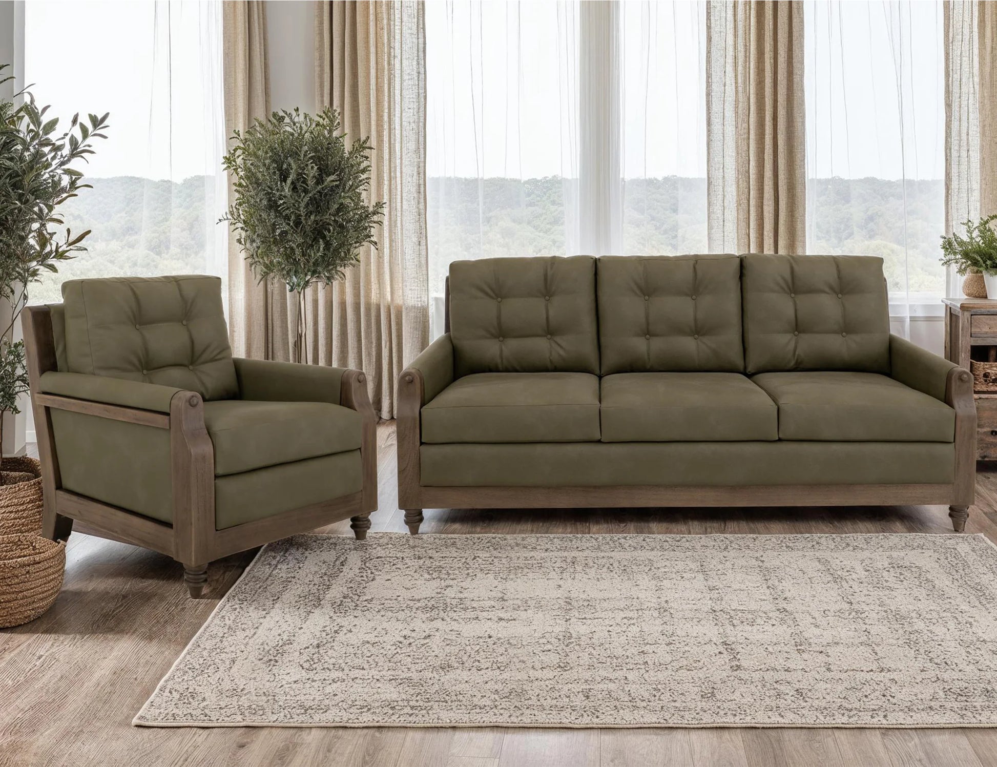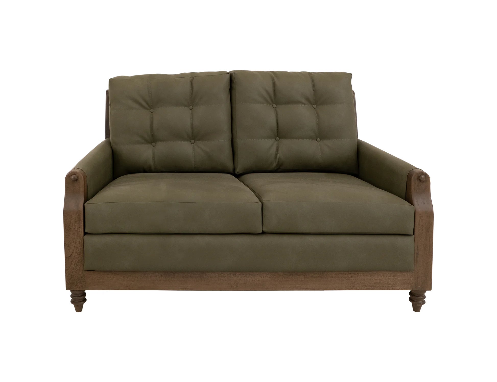 Wooden Frame, Upholstered Loveseat. Transform your living space with this stunning wooden-framed loveseat, which perfectly combines craftsmanship and comfort. The Xel-Ha II Collection features tufted back cushions upholstered in a green leather-like fabric, providing plush support and an elegant touch. The decorative throw pillows add a charming and warm accent to the overall design. What truly sets this collection apart is its beautifully designed, gently curved armrests, enhancing its aesthetic appeal and ergonomic comfort. The turned wooden legs, with their intricate detailing, showcase timeless sophistication. Redefine your space with furniture that makes a statement because every home deserves a touch of artistry.
