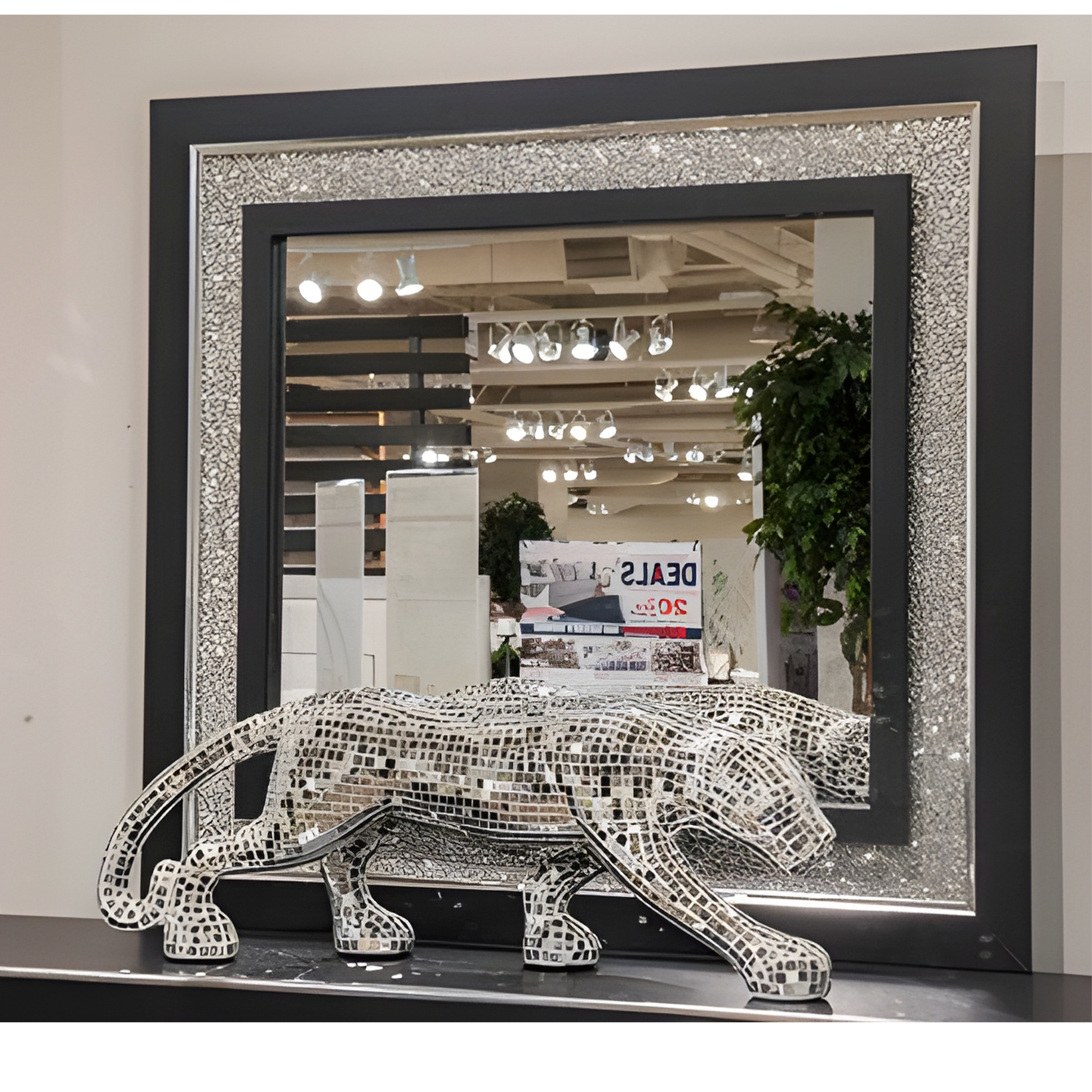 If glitz and glam are your jam, you’re gonna love this bedroom mirror. Gleaming glitter and dazzling chrome-tone touches wow against a sophisticated matte black finish for a stunning pop of pizzazz. Loaded with its serious sparkle, it's a simply splendid place to check your look.