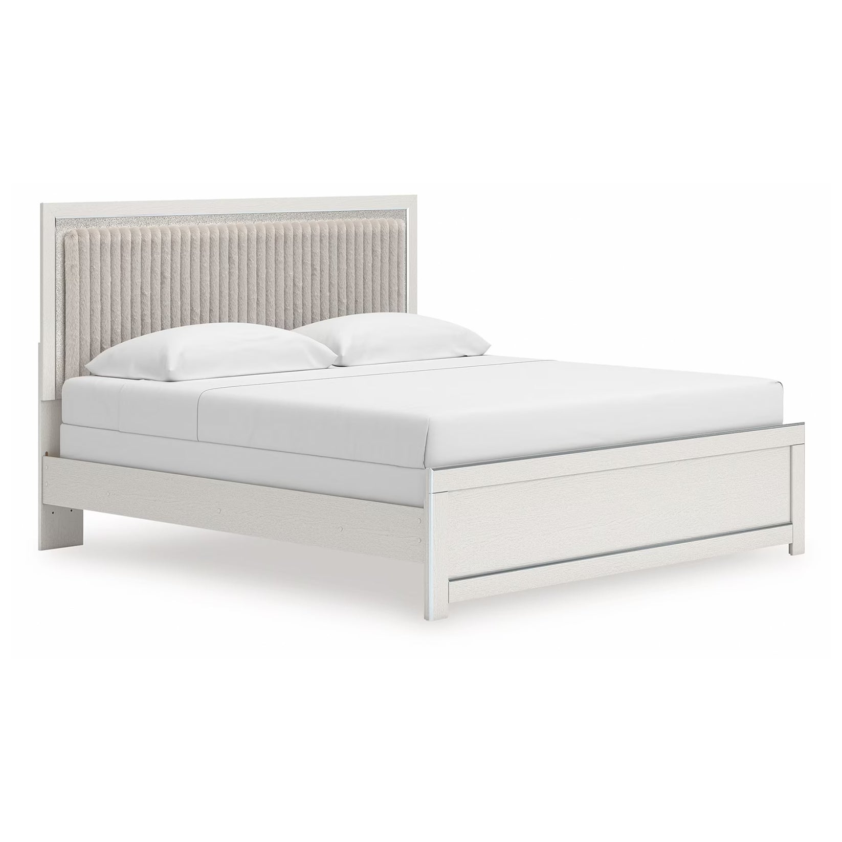 If glitz and glam are your jam, you’re gonna love this king upholstered panel bed. Gleaming glitter and dazzling chrome-tone touches are paired with tufted gray faux fur for a stunning pop of pizzazz. Loaded with chic flair and serious sparkle, it's a simply splendid way to wake up your inner sanctum’s style.